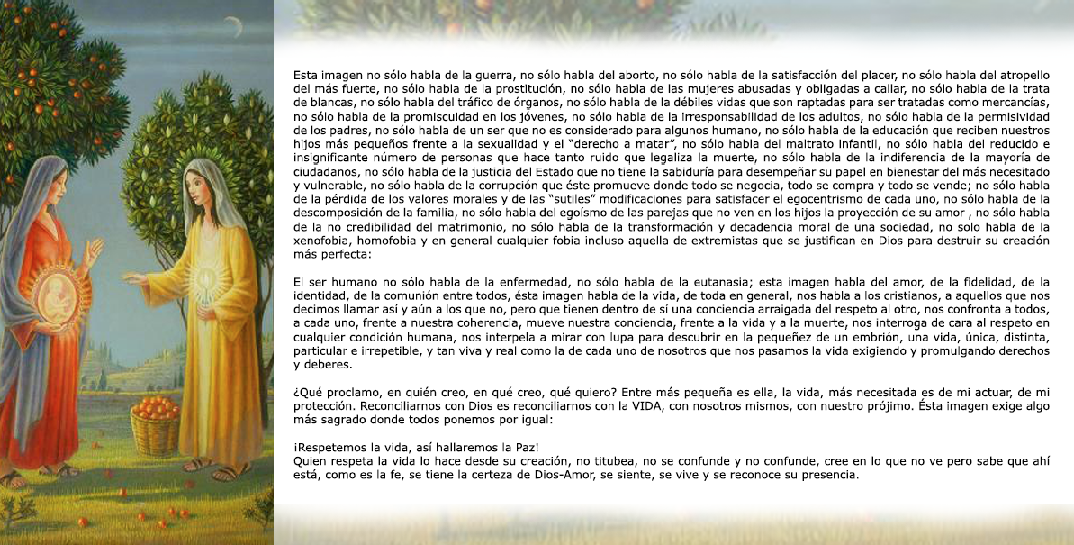 “La Virgen María sintió deseos de ir a visitar a su prima Santa Isabel. Como iba llena de la Gracia de Dios, inundó la casa de su prima de bendiciones. En cuanto oyó el saludo de María, saltó de gozo el niño en su seno e Isabel quedó llena de Espíritu Santo. Muy agradecida le dijo a María: “Bendita tú entre las mujeres y bendito el fruto de vientre. ¿De dónde a mí que la madre de mi Señor venga a visitarme?”
