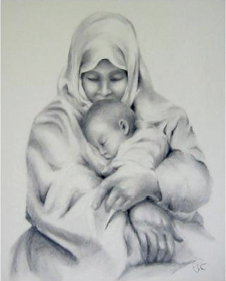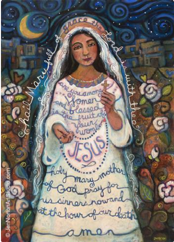 10 – Jen Norton explica que a través del arte es capaz de comprometerse más profundamente con la “compasión y misericordia en las cualidades ‘femeninas’ de Dios”, que habían estado ausentes por la obsesión de “seguir las reglas” en la religiosidad de su infancia. En el “Ave María” busca “apartarse de lo perfecto, la María de ojos azules encontrada típicamente en imágenes occidentales, y retratada con los pies en la tierra, joven hebrea que valientemente nos lleva a Jesús”. Ver más de la obra del artista en http://www.jennortonartstudio.com
