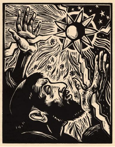 13 – En este grabado, “Canción de la Creación,” Julie Lonneman representa a San Francisco cantando en éxtasis el Cántico del Sol: “Aunque débil y casi ciego, compuso esta canción de alabanza cuando sentía que se acercaba el final de su vida terrenal”. Lonneman agradece la “labor sacerdotal que se le ha dado como mujer y como artista.” Encuentre más de la obra del artista en http://julielonneman.blogspot.com
