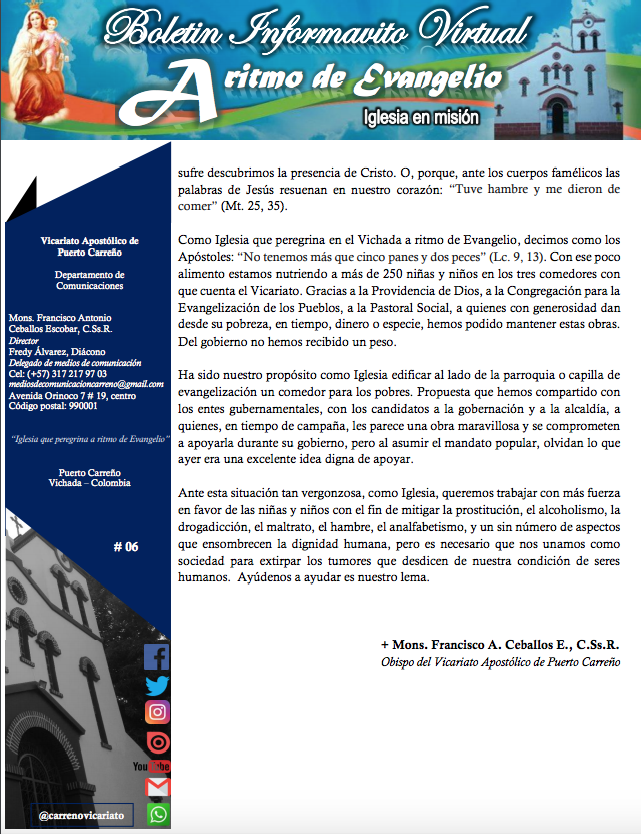 Por su parte, recordó que la Iglesia siempre ha estado presente acompañando no solamente a las comunidades indígenas, sino también ofreciendo atención a la población migrante. “Estamos nutriendo a más de 250 niñas y niños en los tres comedores con que cuenta el Vicariato. Gracias a la Providencia de Dios, a la Congregación para la Evangelización de los Pueblos, a la Pastoral Social, quienes con generosidad dan desde su pobreza, en tiempo, dinero o especie para mantener estas obras. Del gobierno no hemos recibido un peso”.