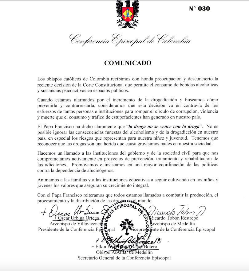 “Cuando estamos alarmados por el incremento de la drogadicción y buscamos cómo prevenirla y contrarrestarla, consideramos que esta decisión va en contravía de los esfuerzos de tantas personas e instituciones para romper el círculo de corrupción, violencia y muerte que el consumo y tráfico de estupefacientes han generado en nuestro país”.