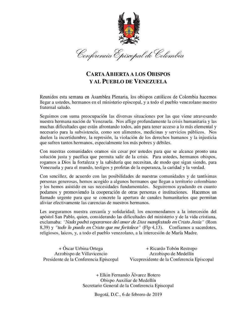 Haciendo frente a la actual crisis el episcopado colombiano, emitió el 6 de febrero una carta abierta a los obispos y al pueblo venezolano en la que expresan su cercanía con la comunidad y la Iglesia en este país. Tras manifestar su preocupación por las diversas situaciones que se viven, los prelados advirtieron la urgencia de “apertura de canales humanitarios que permitan aliviar efectivamente las carencias de nuestros hermanos”.