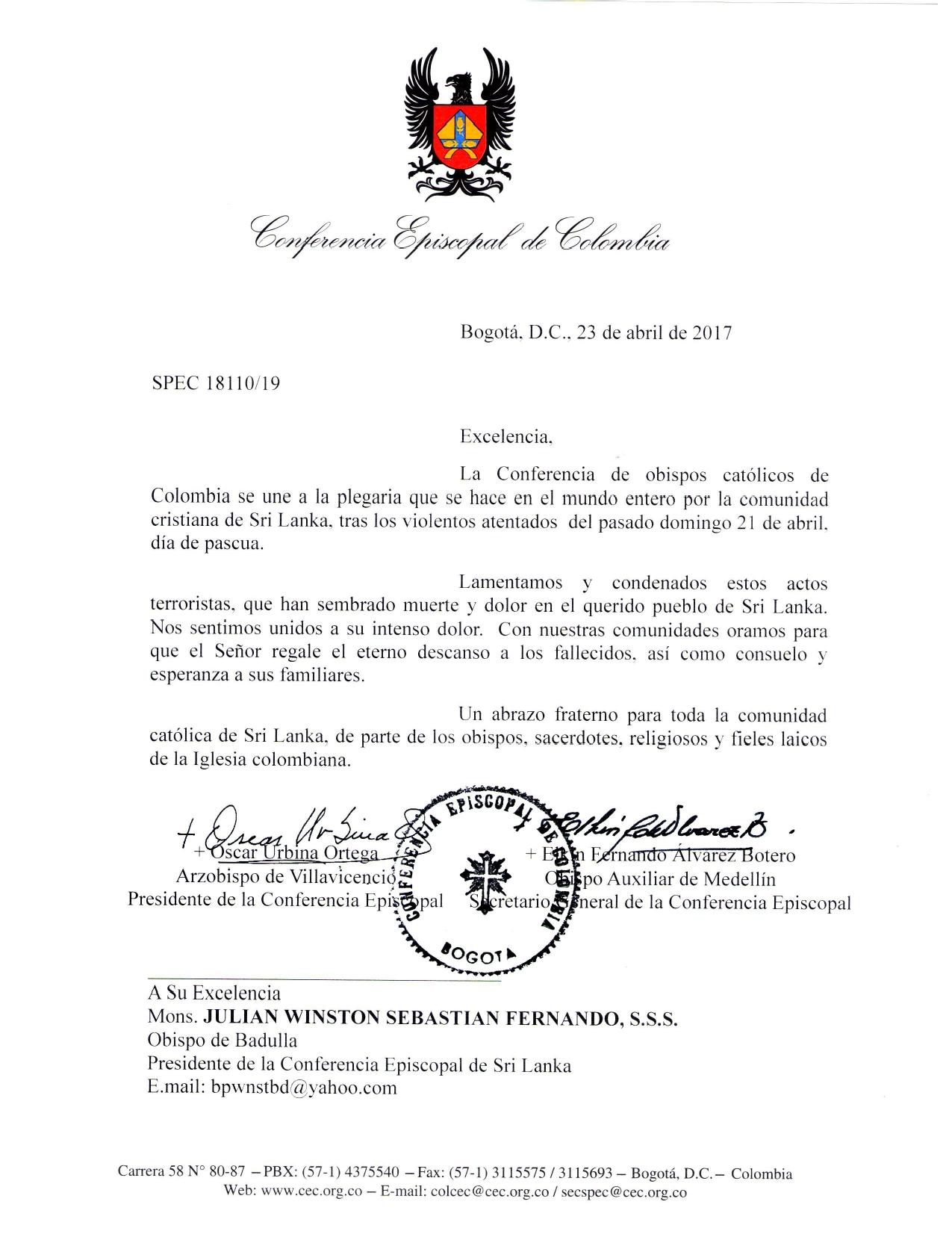 “Colombia se une a la plegaria que se hace en el mundo entero por la comunidad cristiana de Sri Lanka (…) Nos sentimos unidos a su intenso dolor. Con nuestras comunidades oramos para que el Señor regale el eterno descanso a los fallecidos, así como consuelo y esperanza a sus familiares”, se lee en la misiva.