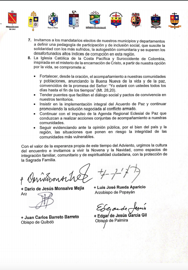 Ante este panorama, los obispos se comprometen a fortalecer la oración, tender puentes que faciliten el diálogo social y pactos de convivencia, insistir en la implementación integral del Acuerdo de Paz y continuar promoviendo la solución negociada al conflicto armado, seguir impulsando una Agenda Regional Eclesial de Paz y, por último, continuar evidenciando ante la opinión pública las situaciones que ponen en riesgo la integridad de las comunidades más vulnerables.