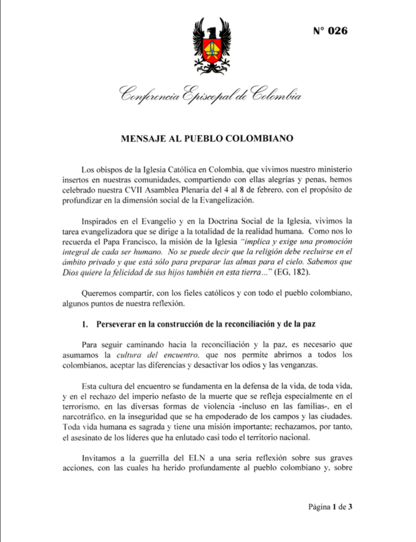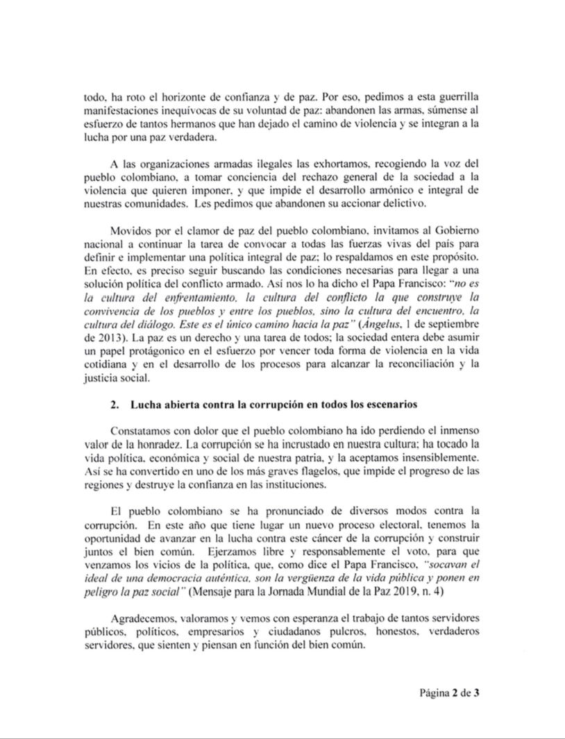 Tras ratificar el rechazo al “imperio nefasto de la muerte” e insistir en defensa de la vida, invitaron a “la guerrilla del ELN a una seria reflexión sobre sus graves acciones” y pidieron a esta guerrilla “abandonen las armas, súmense al esfuerzo de tantos hermanos que han dejado el camino de violencia y se integran a la lucha por una paz verdadera”.