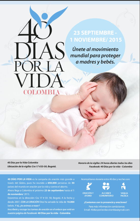 Llega a Colombia la campaña de oración Provida más grande del Mundo “40 días por la vida”, que busca salvar la vida de madres y bebés de la fatídica opción del aborto. En el marco de la semana por la paz, un grupo de laicos residentes de Bogotá invita a unirse en oración y vigilia pacifica durante 40 días y 40 noches ininterrumpidas, frente a uno de los sitios donde más abortos se realizan en Bogotá, “Oriéntame”. Ubicado en Teusaquillo, el barrio donde se concentra el mayor numero de “clínicas” de aborto en Latinoamérica.