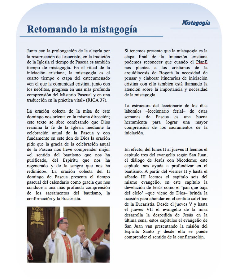 Las apariciones del Resucitado que leemos en el evangelio (Juan 20, 19-31) las podemos asumir como apoyo para la mistagogía en el sentido que el texto nos ayuda a ser reconocer la presencia del Señor en medio de la comunidad cristiana por la celebración dominical y por la Palabra. Hablamos de una presencia ‘misteriosa’ del Resucitado, misteriosa en el sentido que no tendría explicación empírica: «estaban en casa los discípulos con las puertas trancadas, cuando se presentó Jesús».