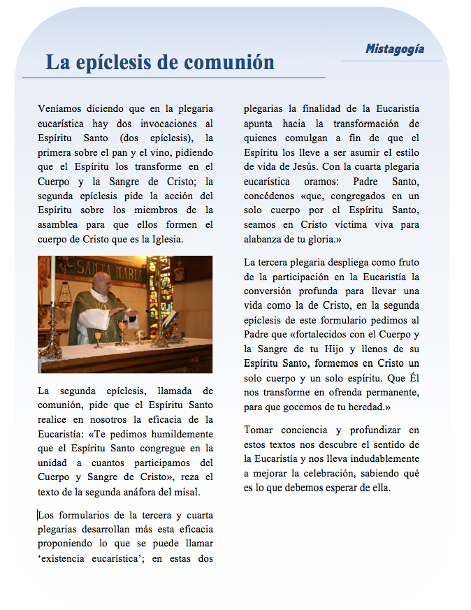 La segunda lectura de este domingo (1 Corintios 10, 16-17) revela la eficacia de la Eucaristía realizando la unidad, pues tomar parte de la fracción del pan es comunión ‒en griego ‘koinonía’‒ con el cuerpo de Cristo. Participando de la Eucaristía somos hombres y mujeres de comunidad: «Aun siendo muchos, todos participamos de un único pan; y por ser único el pan, somos un solo cuerpo.» La Eucaristía realiza la unidad de los discípulos con Cristo.