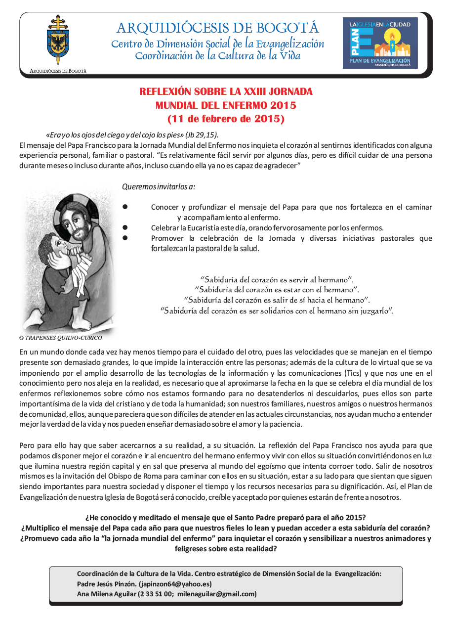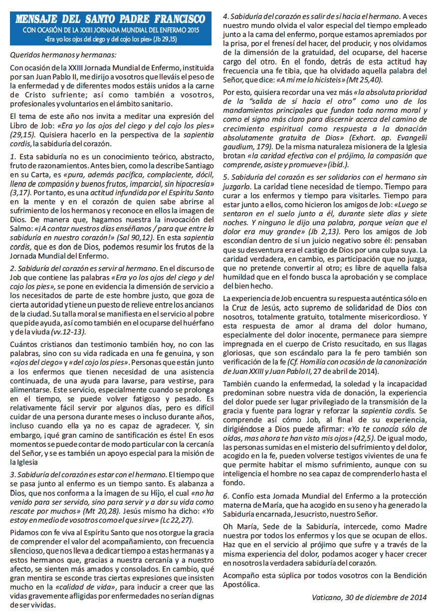 Reflexión sobre la XXIII Jornada Mundial del Enfermo 2015