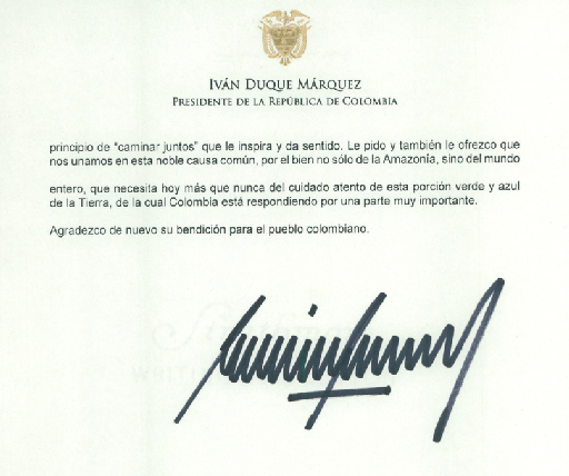 Con ocasión del Sínodo de la Amazonía en el Vaticano, el presidente Iván Duque le dirigió un mensaje de carácter reservado al papa Francisco. En la comunicación, el mandatario colombiano le reafirmó al pontífice el compromiso del Gobierno con la región. A continuación texto completo del mensaje:
