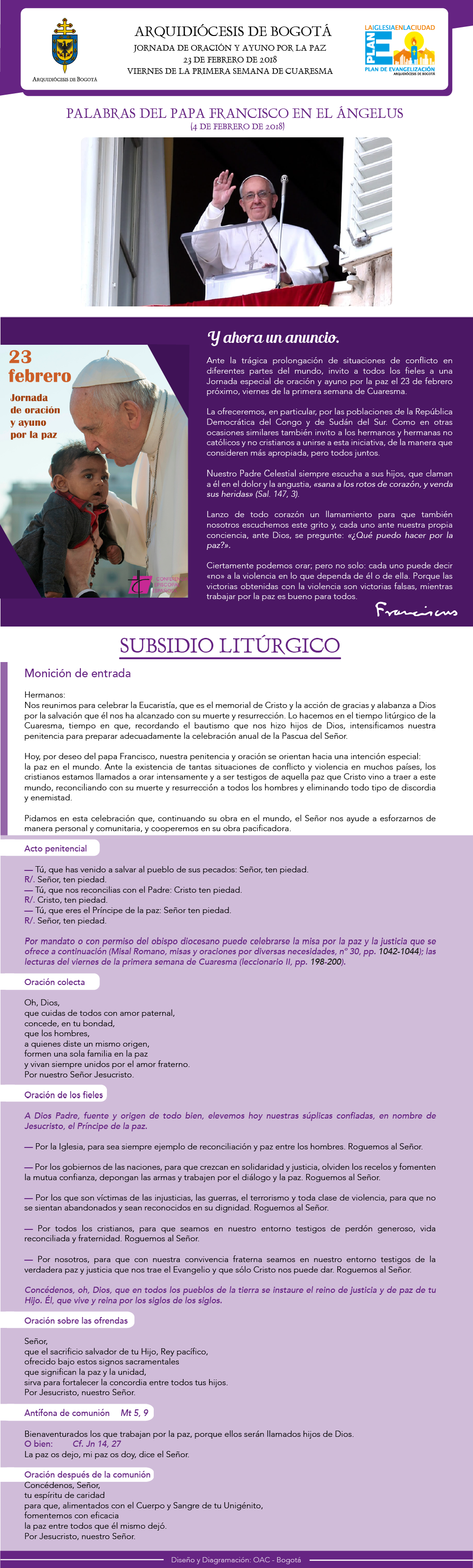 Esta oración por la paz, se hará especialmente por la República Democrática del Congo, Sudán del Sur, y por todos los países que necesitan de la unidad en la oración por la paz.